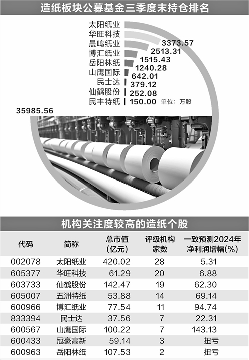 多只造纸个股均为公募基金重仓股。根据今年三季报数据,太阳纸业的基金持股量近3.6亿股,持股数最高,华旺科技、晨鸣纸业、博汇纸业、岳阳林纸的基金持股量均超过1000万股。