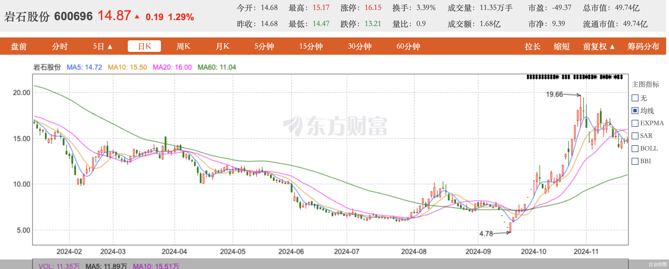 11月21日上海贵酒以14.87元/股收盘,上涨1.29%。从9月19日至今,上海贵酒股价一路上涨,从年内最低价4.78元/股上涨至年内最高价19.66元/股仅用了25个交易日。据北京商报记者不完全统计,自9月以来,上海贵酒已发布7份股票交易异常波动公告以及1份股票交易严重异常波动公告,其中上海贵酒股价自9月18日—10月29日累计13个交易日涨停,日收盘价格涨幅偏离值累计达218.79%。值得注意的是,尽管9月至今上海贵酒股价一路高歌猛进,但自今年初以来,其资本市场表现却经历了一段波动下跌的过程。记者统计,今年首个交易日,上海贵酒以17.98元/股收盘,此后波动下跌直至9月19日触底。