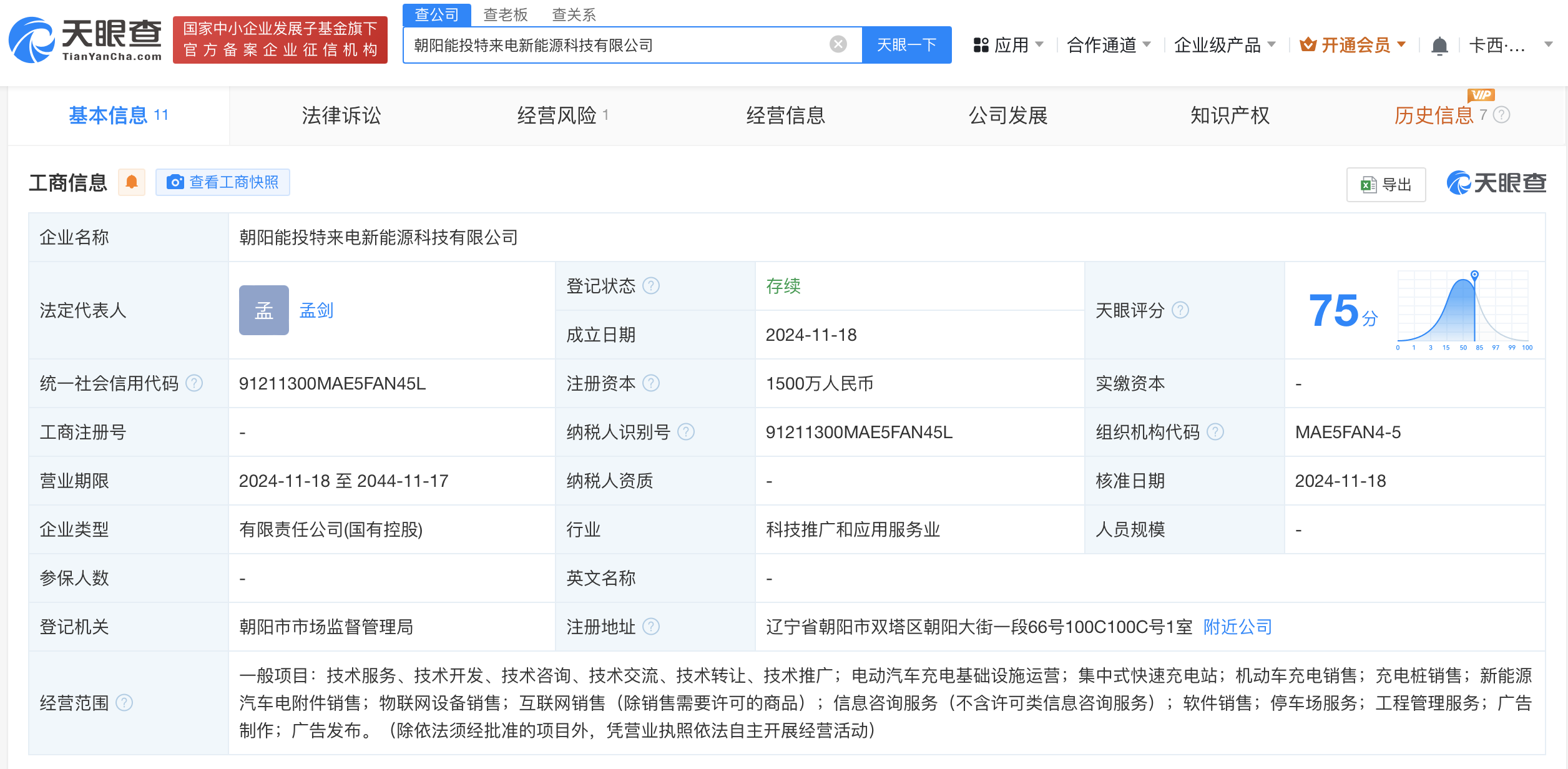 天眼查App显示,近日,朝阳能投特来电新能源科技有限公司成立,法定代表人为孟剑,注册资本1500万人民币,经营范围含电动汽车充电基础设施运营、集中式快速充电站、机动车充电销售、充电桩销售等。股东信息显示,该公司由朝阳能源集团有限公司、特来电新能源股份有限公司分别持股65%、35%。
