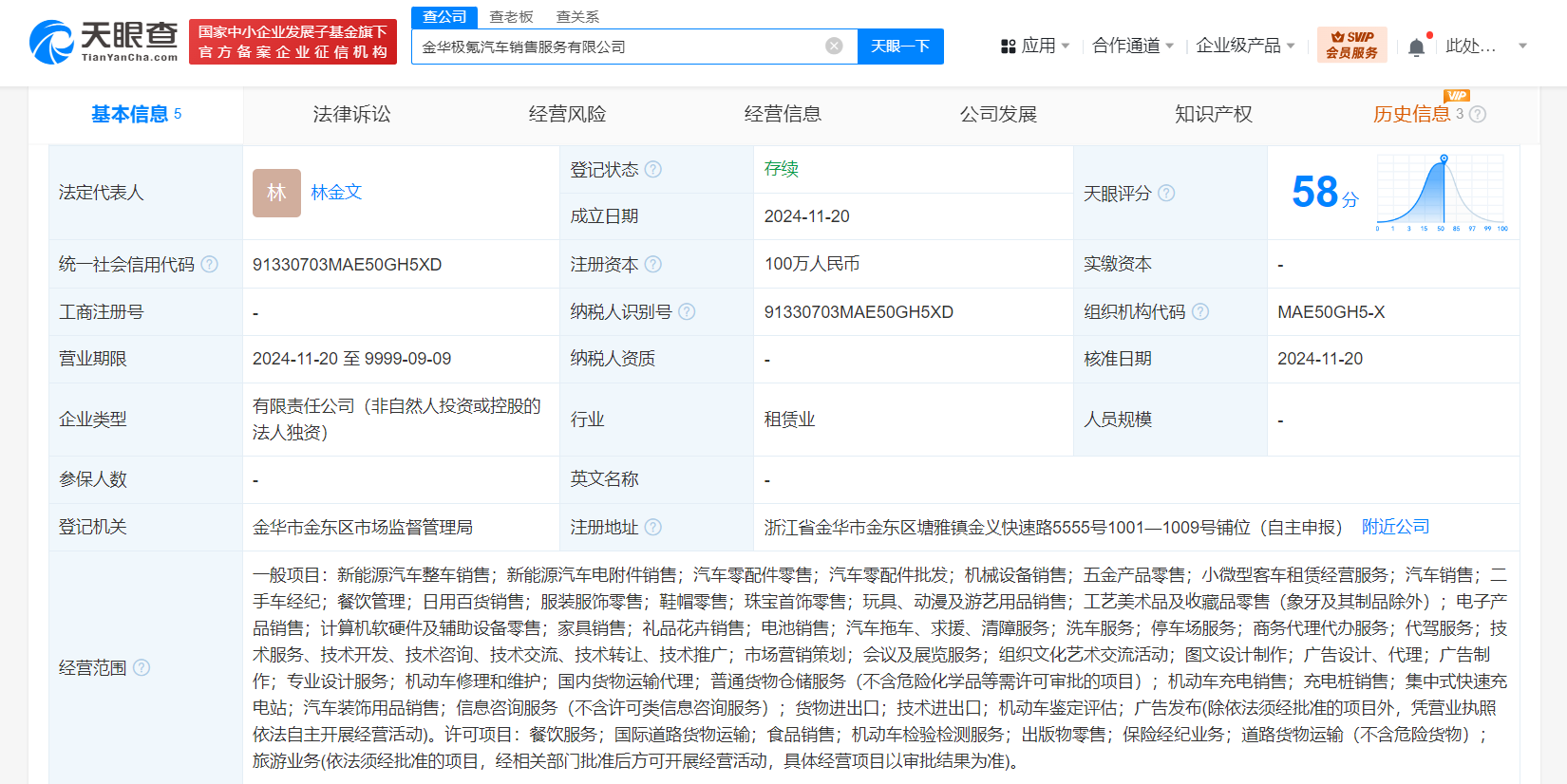 天眼查App显示,近日,金华极氪汽车销售服务有限公司成立,法定代表人为林金文,注册资本100万人民币,经营范围含新能源汽车整车销售、新能源汽车电附件销售、二手车经纪、电池销售、商务代理代办服务、代驾服务、机动车充电销售、信息咨询服务等。股东信息显示,该公司由浙江极氪汽车销售有限公司全资持股。
