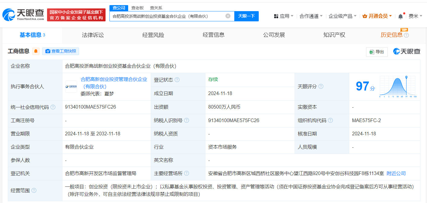 天眼查App显示,近日,合肥高投浙商战新创业投资基金合伙企业(有限合伙)成立,执行事务合伙人为合肥高新创业投资管理合伙企业(有限合伙),出资额8.05亿人民币,经营范围为创业投资,以私募基金从事股权投资、投资管理、资产管理等活动。合伙人信息显示,该基金由合肥高新创业投资管理合伙企业(有限合伙)、浙商聚金嘉融高投基金(合肥)合伙企业(有限合伙)共同出资。