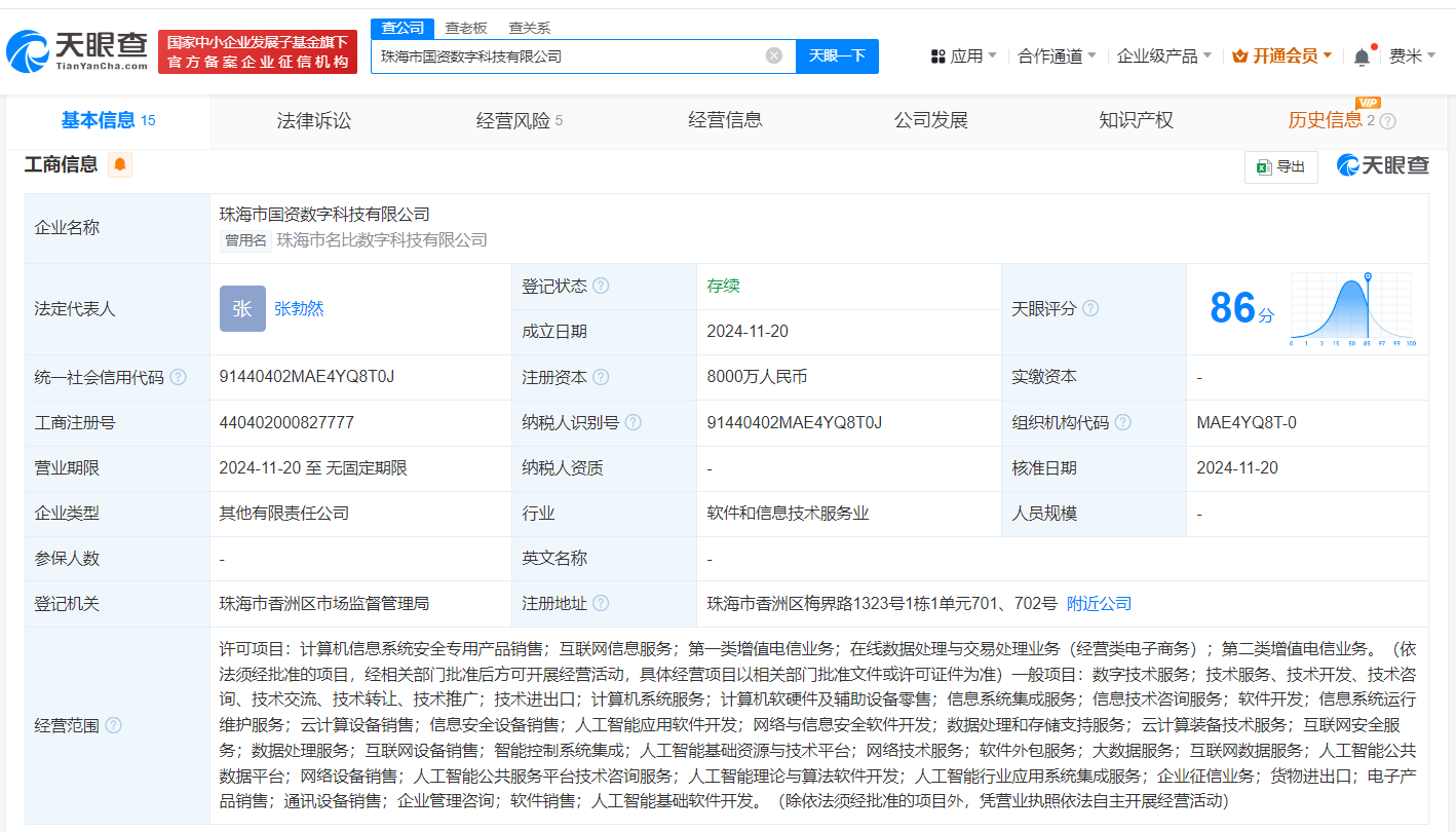 天眼查App显示,近日,珠海市国资数字科技有限公司成立,法定代表人为张勃然,注册资本8000万人民币,经营范围含计算机信息系统安全专用产品销售、互联网信息服务、第一类增值电信业务、第二类增值电信业务、技术进出口、计算机系统服务等,由珠海大横琴集团有限公司、珠海格力集团有限公司、珠海交通控股集团有限公司等共同持股。