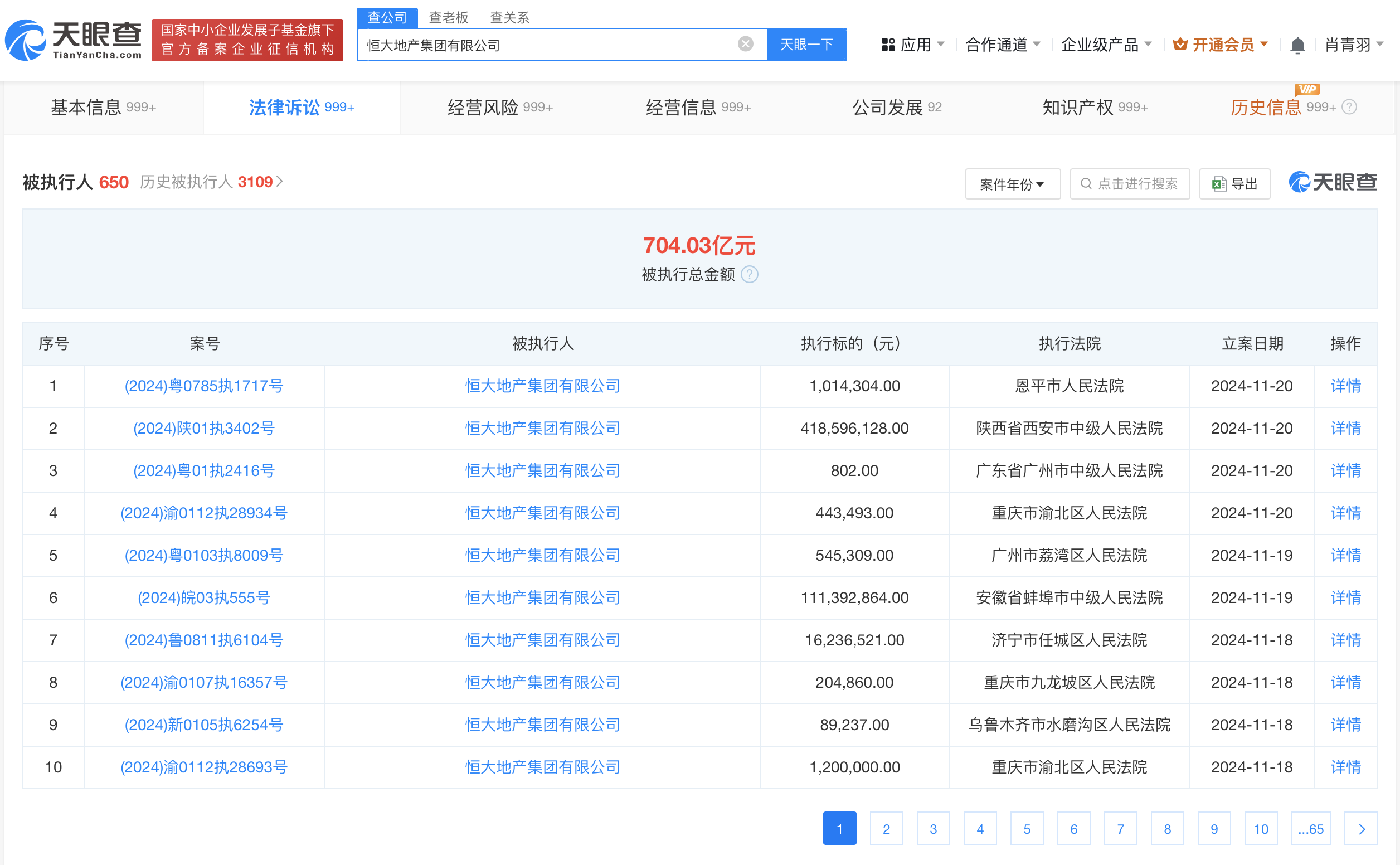 天眼风险信息显示,恒大地产集团有限公司现存650条被执行人信息,被执行总金额超704亿元。此外,该公司还存在多条限制消费令、失信被执行人(老赖)和终本案件信息。