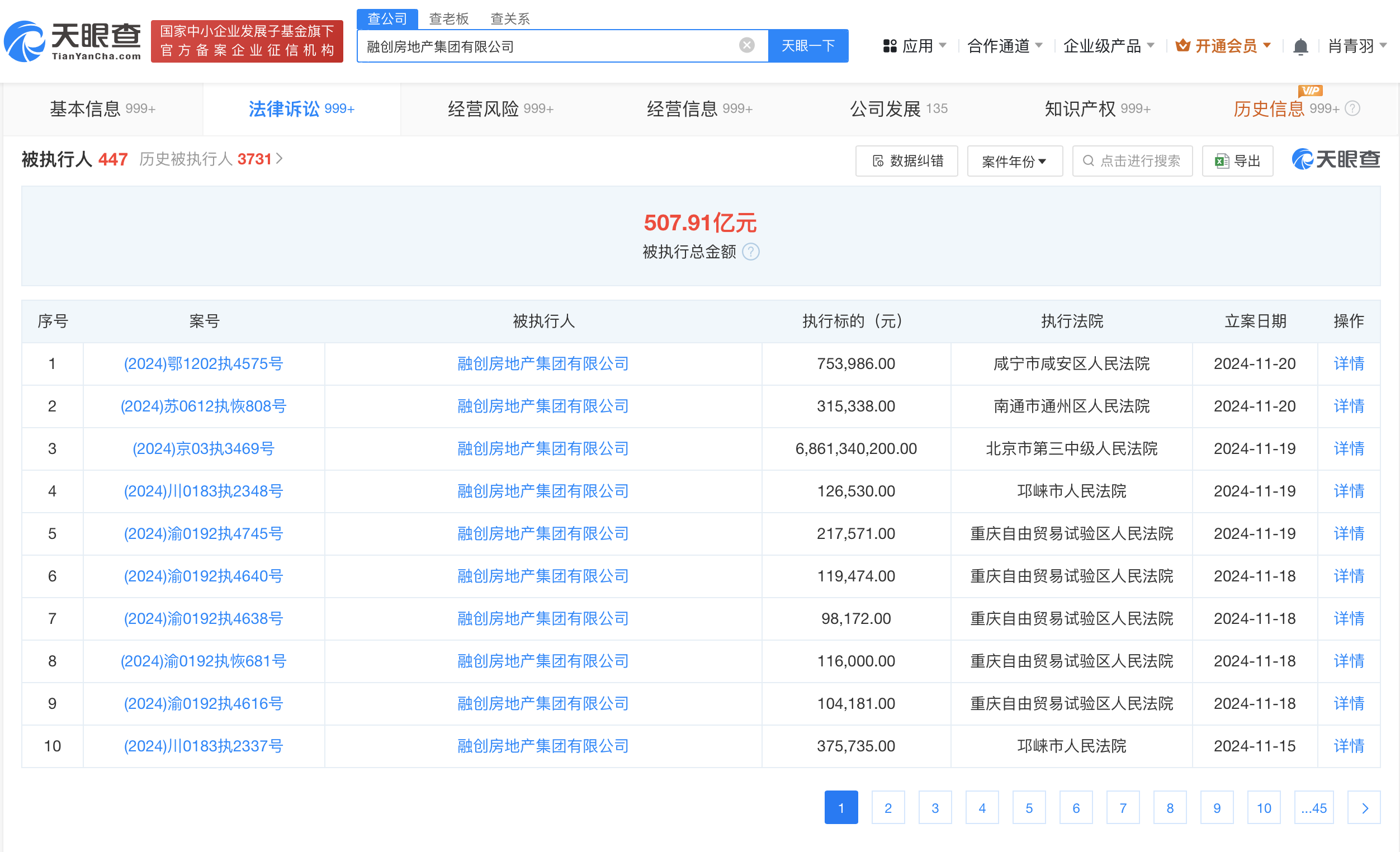 天眼风险信息显示,融创房地产集团有限公司现存440余条被执行人信息,被执行总金额超507亿元。此外,该公司还存在多条限制消费令、失信被执行人(老赖)和终本案件信息。
