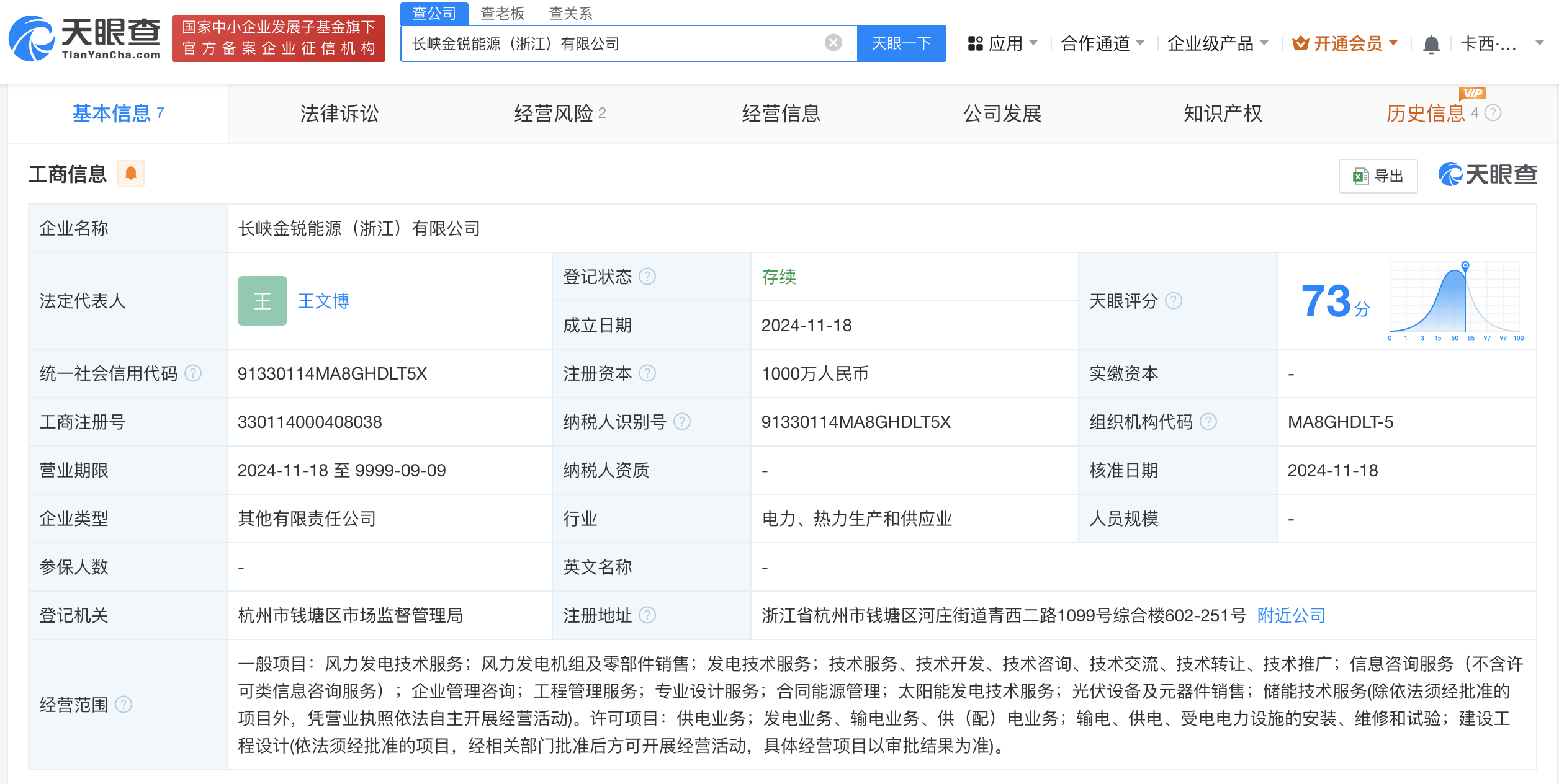 天眼查App显示,近日,长峡金锐能源(浙江)有限公司成立,法定代表人为王文博,注册资本1000万人民币,经营范围含风力发电技术服务、风力发电机组及零部件销售、太阳能发电技术服务、光伏设备及元器件销售等。股东信息显示,该公司由金海股份(832390)、华锐能投(北京)电力有限公司、浙江忞庸建设有限公司分别持股40%、40%、20%。