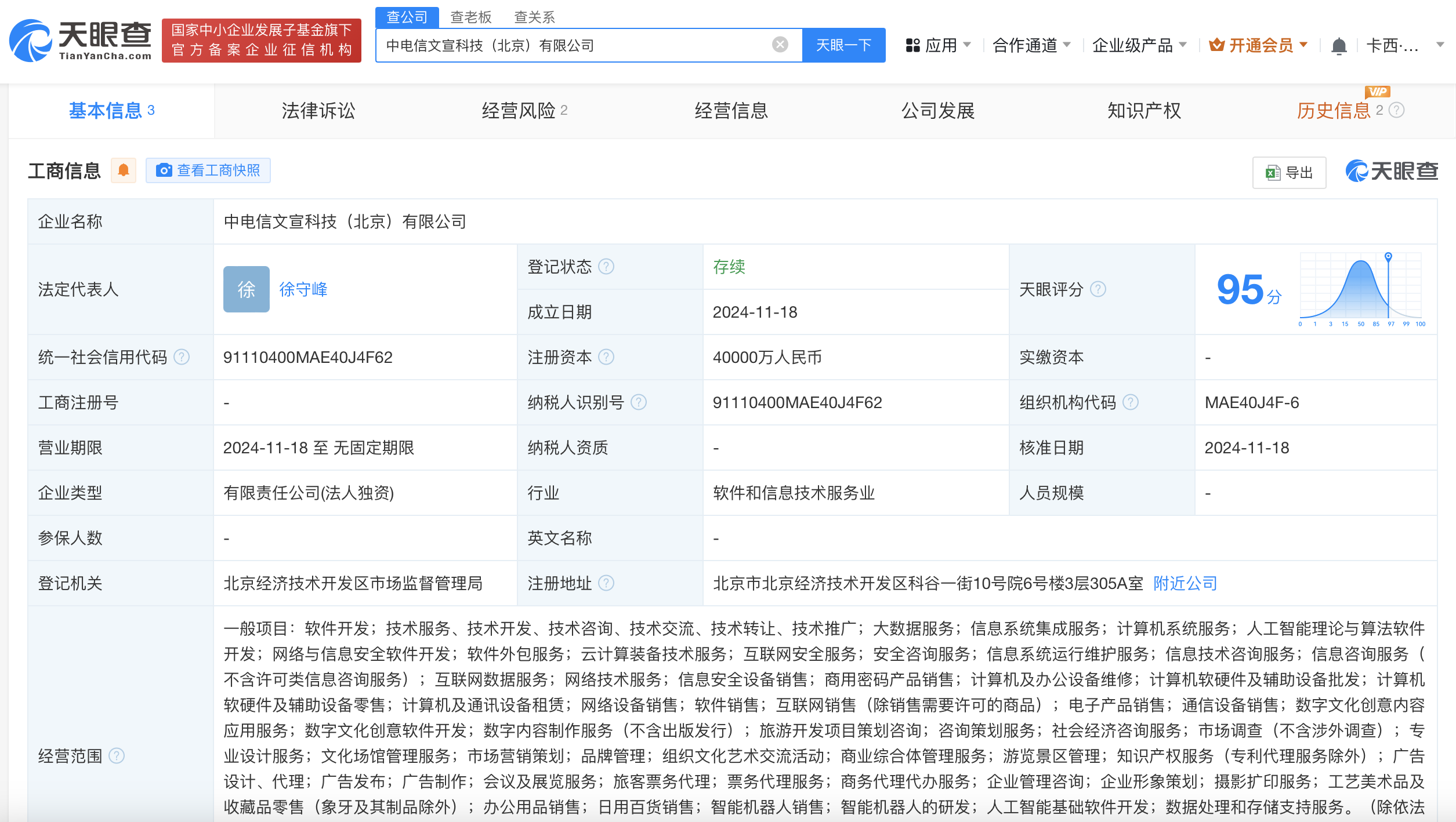 天眼查App显示,近日,中电信文宣科技(北京)有限公司成立,法定代表人为徐守峰,注册资本4亿人民币,经营范围含人工智能理论与算法软件开发、网络与信息安全软件开发、云计算装备技术服务、人工智能基础软件开发等。股东信息显示,该公司由中国电信(601728)全资持股。