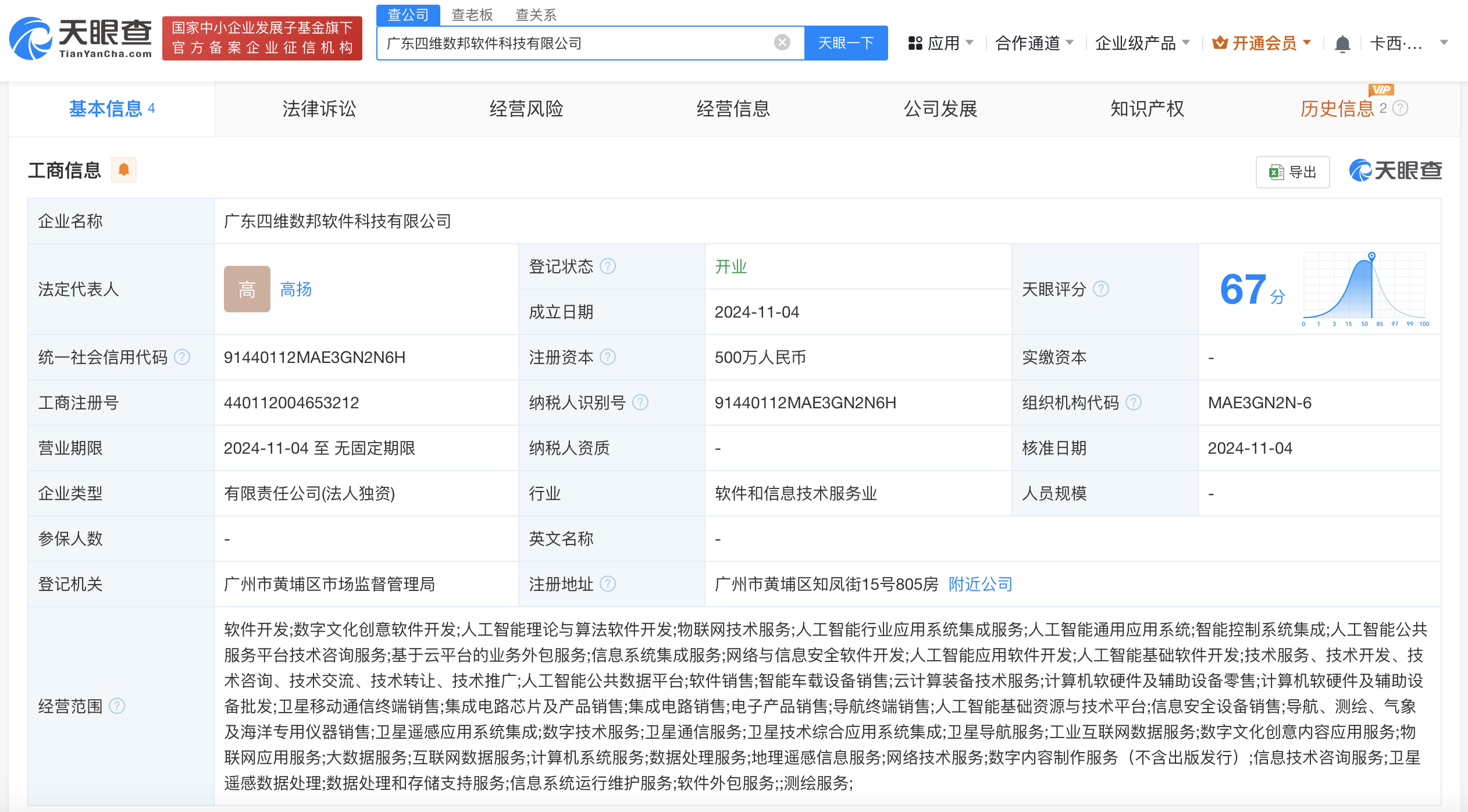 天眼查App显示,近日,广东四维数邦软件科技有限公司成立,法定代表人为高扬,注册资本500万人民币,经营范围含人工智能理论与算法软件开发、物联网技术服务、人工智能行业应用系统集成服务、人工智能通用应用系统等。股东信息显示,该公司由四维图新(002405)持股的陕西四维数邦科技有限公司全资持股。