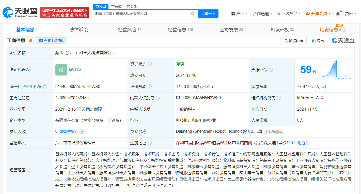 戴盟(深圳)机器人科技有限公司成立于2021年12月,法定代表人为段江哗,经营范围含智能机器人的研发、智能机器人销售、人工智能应用软件开发、人工智能基础软件开发、软件外包服务、智能控制系统集成等,现由段江哗、奥利(天津)科技合伙企业(有限合伙)、速泼漫(天津)科技合伙企业(有限合伙)及上述新增股东等共同持股。公开资料显示,该公司专注于研发和生产真正可商用的多系列通用仿人机器人产品。