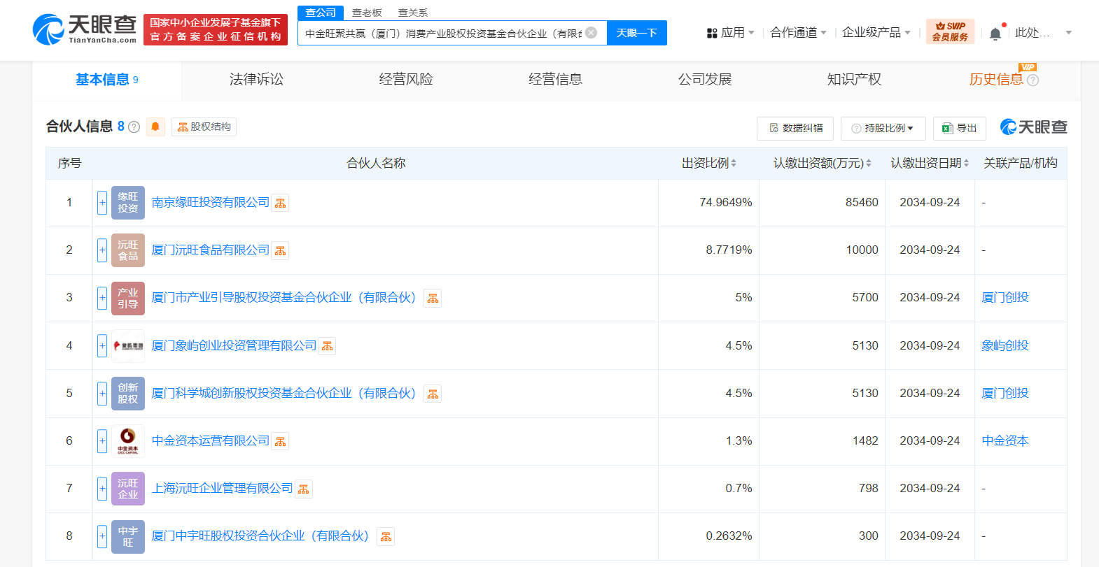 天眼查App显示,近日,中金旺聚共赢(厦门)消费产业股权投资基金合伙企业(有限合伙)成立,执行事务合伙人为中金资本运营有限公司,出资额11.4亿人民币,经营范围为以私募基金从事股权投资、投资管理、资产管理等活动。合伙人信息显示,该基金由南京缘旺投资有限公司、厦门沅旺食品有限公司、中金资本运营有限公司等8位合伙人共同出资。