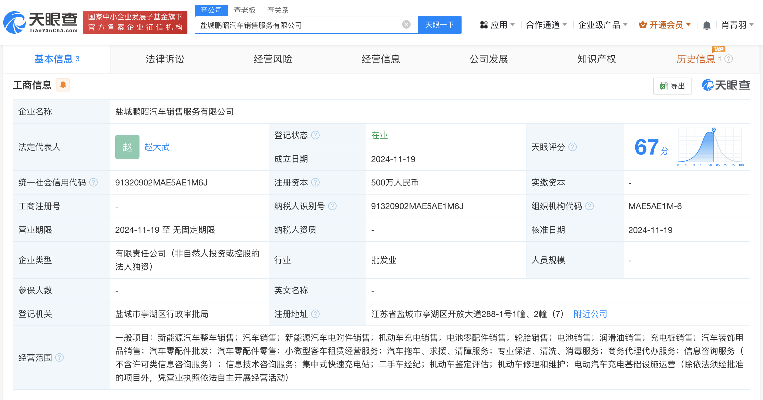 天眼查App显示,近日,盐城鹏昭汽车销售服务有限公司成立,法定代表人为赵大武,注册资本500万人民币,经营范围含新能源汽车整车销售、新能源汽车电附件销售、电池零配件销售、商务代理代办服务、信息技术咨询服务、二手车经纪等。股权穿透图显示,该公司由盐城小鹏汽车销售服务有限公司全资持股,后者为小鹏汽车销售有限公司全资子公司。