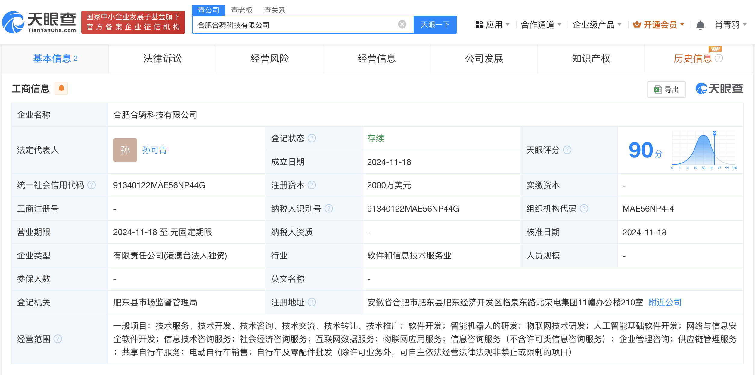天眼查App显示,近日,合肥合骑科技有限公司成立,法定代表人为孙可青,注册资本2000万美元,经营范围含软件开发、智能机器人的研发、物联网技术研发、人工智能基础软件开发、网络与信息安全软件开发、信息技术咨询服务等。股东信息显示,该公司由美团旗下Xigua Limited全资持股。