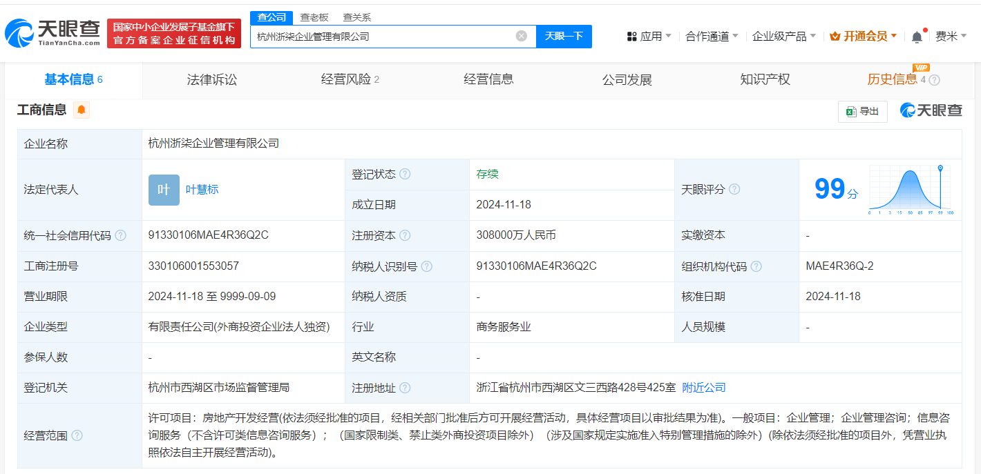 天眼查App显示,近日,杭州浙柒企业管理有限公司、杭州浙乔企业管理有限公司成立,法定代表人均为叶慧标,注册资本分别为30.8亿人民币、7.7亿人民币,经营范围包含房地产开发经营、企业管理、企业管理咨询、信息咨询服务,均由绿城房地产集团有限公司全资持股。