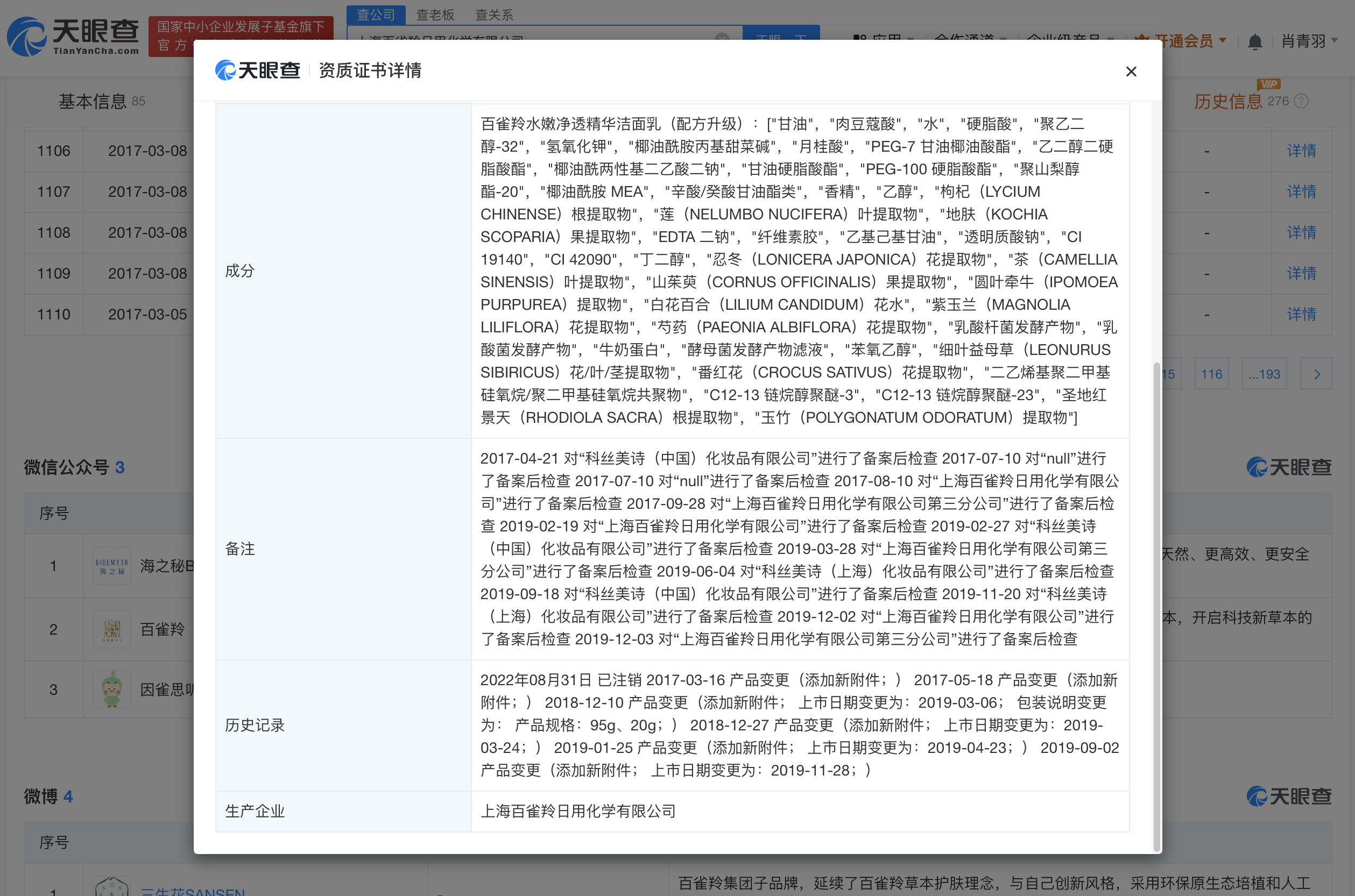 天眼查App显示,上海百雀羚日用化学有限公司成立于2000年10月,法定代表人为李强,注册资本3000万人民币,经营范围含日用化学品的技术开发、技术服务等,由李强、朱晨晖共同持股。经营信息显示,该公司拥有多个国产非特殊用途化妆品备案。该公司于2017年3月5日备案的沪G妆网备字2017003990号“百雀羚水嫩净透精华洁面乳”,最后一次涉及“圆叶牵牛提取物”成分。该公司于2021年4月25日备案的“百雀羚水嫩净透精华洁面乳(新配方)”中,已无“圆叶牵牛提取物”成分。目前,上述两则备案均已注销。