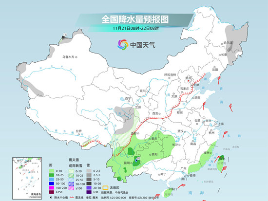 今明天(11月20日至21日),华南仍有明显降雨,局地有暴雨,同时西南地区降水频繁,需注意防范。气温方面,中东部大部地区未来三天以升温为主,内蒙古、东北地区等地明后天有小幅降温。
