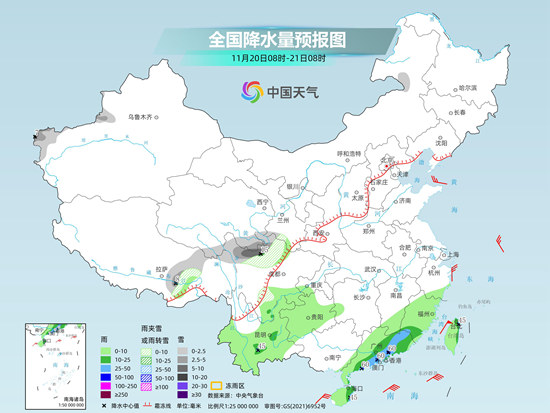 昨天,我国降水范围缩减,较强降雨主要出现在华南沿海部分地区,同时,青藏高原东部、西南地区有雨雪天气。监测显示,19日8时至20日6时,海南岛北部、广东南部和东部、福建南部、台湾岛北部等地部分地区出现中到大雨,广东南部、台湾岛北部等局地暴雨,广东阳江单点大暴雨;青海东部、川西高原东北部、甘肃南部、陕西北部等地部分地区出现降雪或雨夹雪。