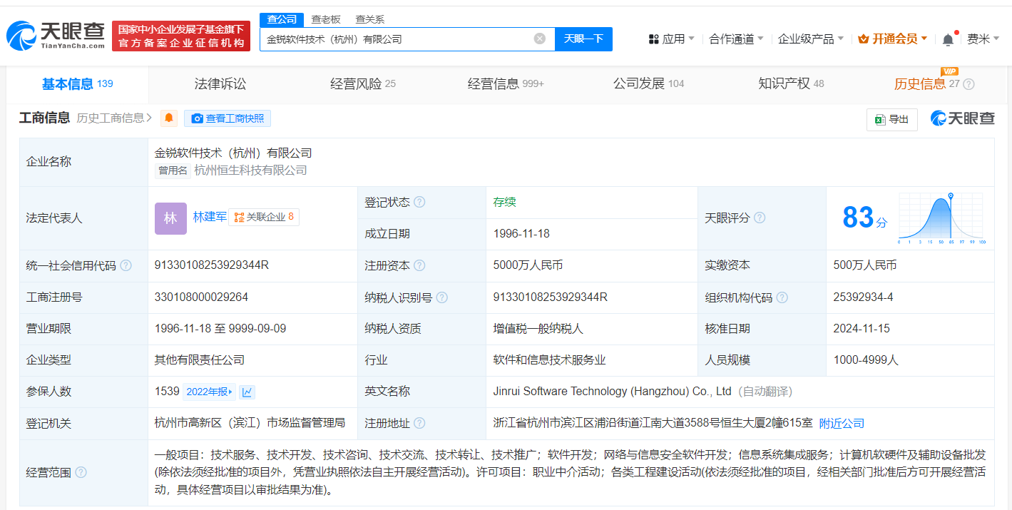 金锐软件技术(杭州)有限公司成立于1996年11月,法定代表人为林建军,注册资本5000万人民币,经营范围含网络与信息安全软件开发、信息系统集成服务、职业中介活动等,现由慧博云通科技股份有限公司、恒生电子(600570)共同持股。