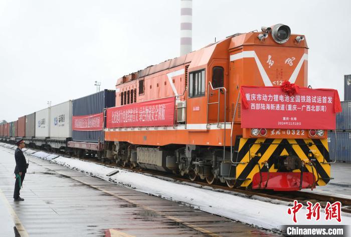 11月19日,搭载有新能源汽车动力锂离子电池的列车,从重庆市长寿区发车,沿着西部陆海新通道一路向南,驶往广西。据悉,这是2024年9月,中国国家铁路集团有限公司公布《40英尺集装箱装运电动汽车用动力锂离子电池铁路安全运输试运条件》后,全国铁路在西南地区“两省一市”(四川、贵州、重庆)率先开展的汽车动力锂离子电池试运,也是西部陆海新通道首次运输汽车动力锂离子电池。中新社记者 周毅 摄