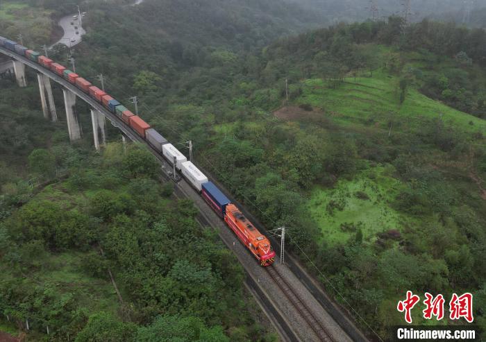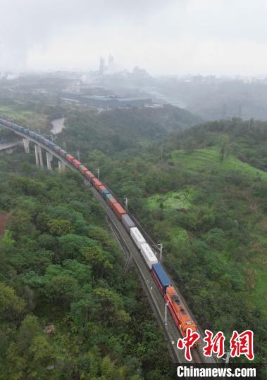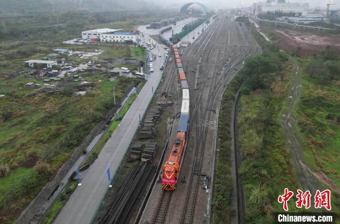 11月19日,搭载有新能源汽车动力锂离子电池的列车,从重庆市长寿区发车,沿着西部陆海新通道一路向南,驶往广西。据悉,这是2024年9月,中国国家铁路集团有限公司公布《40英尺集装箱装运电动汽车用动力锂离子电池铁路安全运输试运条件》后,全国铁路在西南地区“两省一市”(四川、贵州、重庆)率先开展的汽车动力锂离子电池试运,也是西部陆海新通道首次运输汽车动力锂离子电池。(无人机照片)中新社记者 周毅 摄