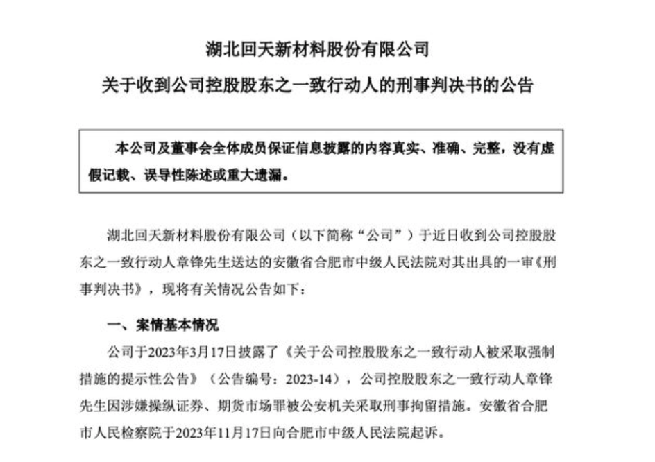 11月15日晚间,湖北回天新材料股份有限公司(300041,以下简称“回天新材”)公告称,公司近日收到控股股东之一致行动人章锋送达的安徽省合肥市中级人民法院对其出具的一审《刑事判决书》,法院判决章锋犯操纵证券市场罪,一审判处有期徒刑8年,并处罚金1.5亿元,没收违法所得。