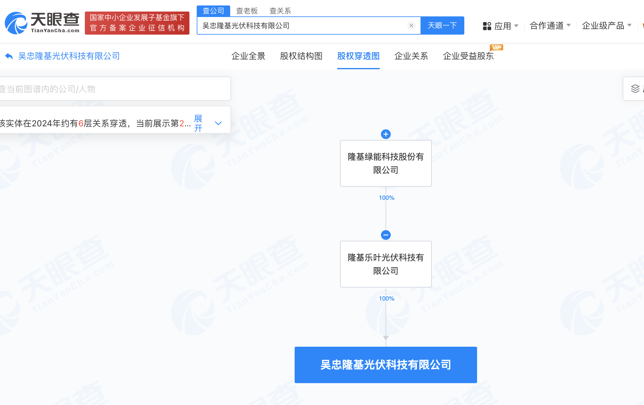 天眼查App显示,近日,吴忠隆基光伏科技有限公司成立,法定代表人为任乃俊,注册资本1000万人民币,经营范围含光伏设备及元器件制造、电子元器件与机电组件设备销售、太阳能发电技术服务等。股权全景穿透图显示,该公司由隆基乐叶光伏科技有限公司全资持股,后者为隆基绿能(601012)全资子公司。