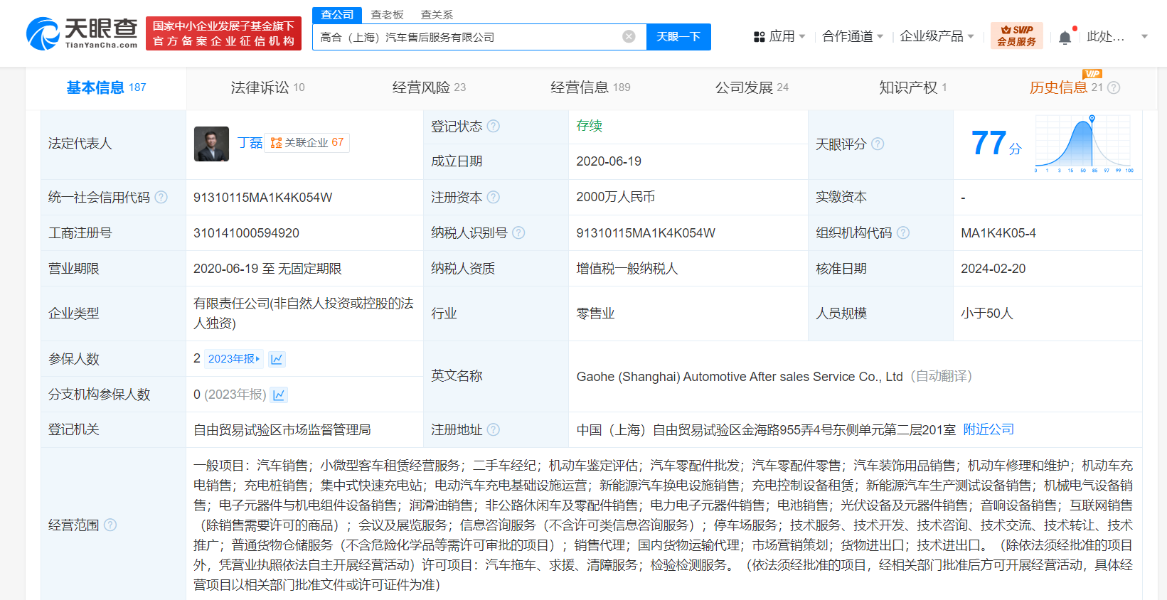 高合(上海)汽车售后服务有限公司成立于2020年6月,注册资本2000万人民币,经营范围含汽车销售、小微型客车租赁经营服务、二手车经纪、机动车鉴定评估、汽车零配件批发、机动车充电销售、充电桩销售等。股东信息显示,该公司由高合(青岛)汽车销售服务有限公司全资持股。