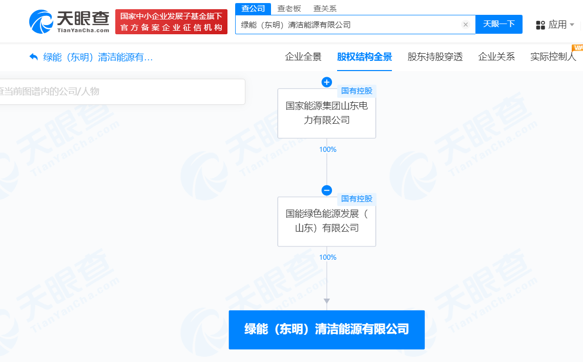 天眼查App显示,近日,绿能(东明)清洁能源有限公司成立,法定代表人为陈效兵,注册资本4.14亿人民币,经营范围含发电业务、输电业务、供(配)电业务,风力发电技术服务,太阳能发电技术服务,储能技术服务,集中式快速充电站,新兴能源技术研发等。股权全景穿透图显示,该公司由国能绿色能源发展(山东)有限公司全资持股,后者由国电电力(600795)间接全资持股。
