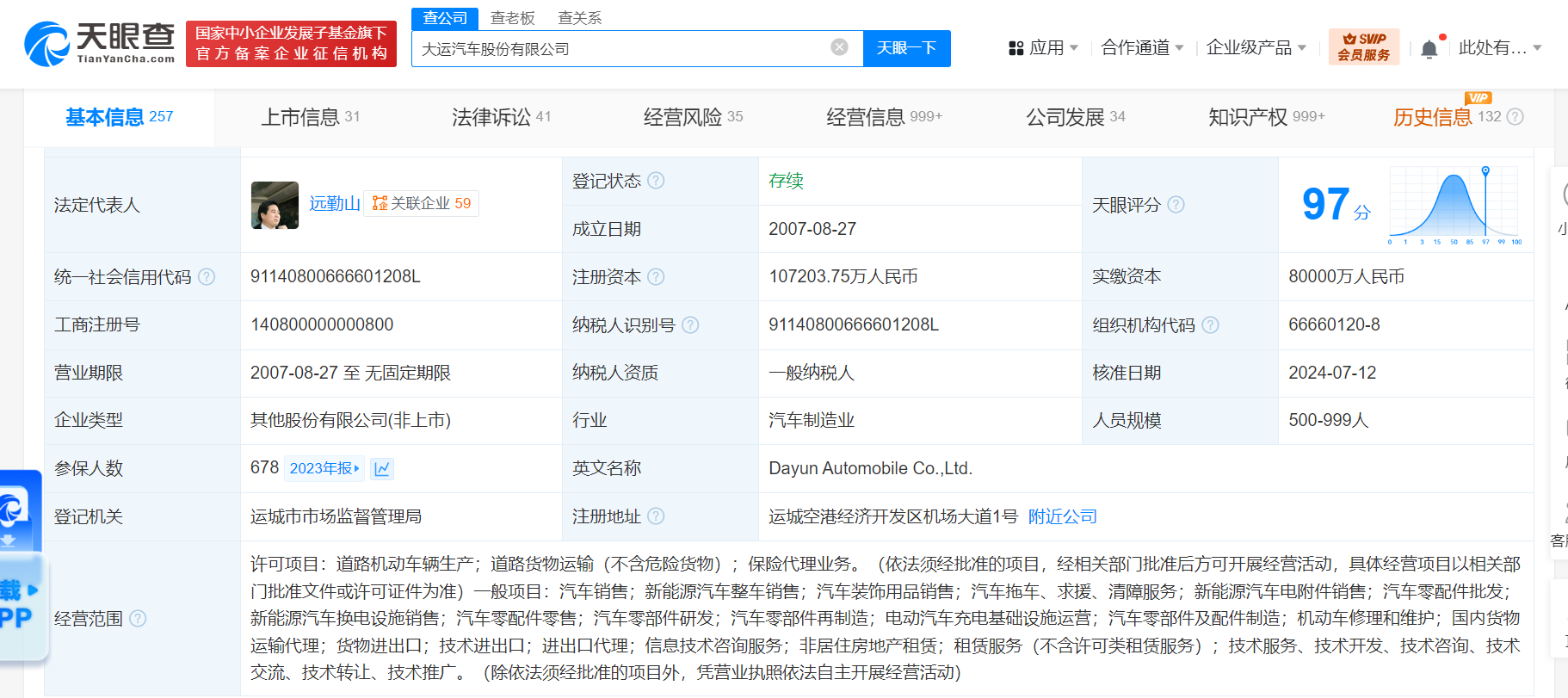 大运汽车股份有限公司成立于2007年8月,法定代表人为远勤山,注册资本约10.72亿人民币,经营范围含道路机动车辆生产、道路货物运输、汽车销售、新能源汽车整车销售、新能源汽车电附件销售等,由大运九州集团有限公司、大运集团有限公司共同持股。