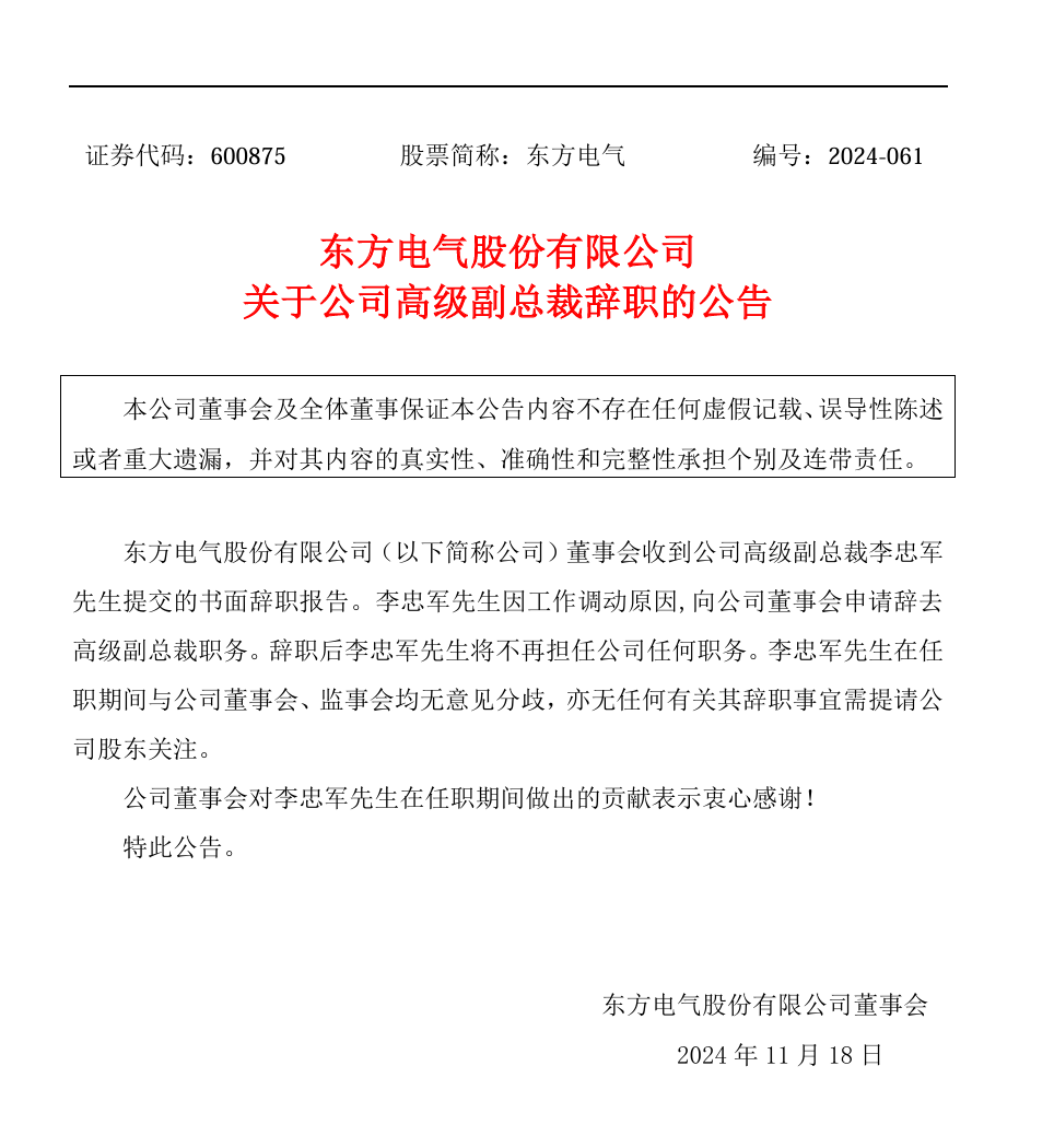 11月18日,东方电气发布公告称,公司董事会收到公司高级副总裁李忠军先生提交的书面辞职报告。李忠军先生因工作调动原因,向公司董事会申请辞去高级副总裁职务。辞职后李忠军先生将不再担任公司任何职务。