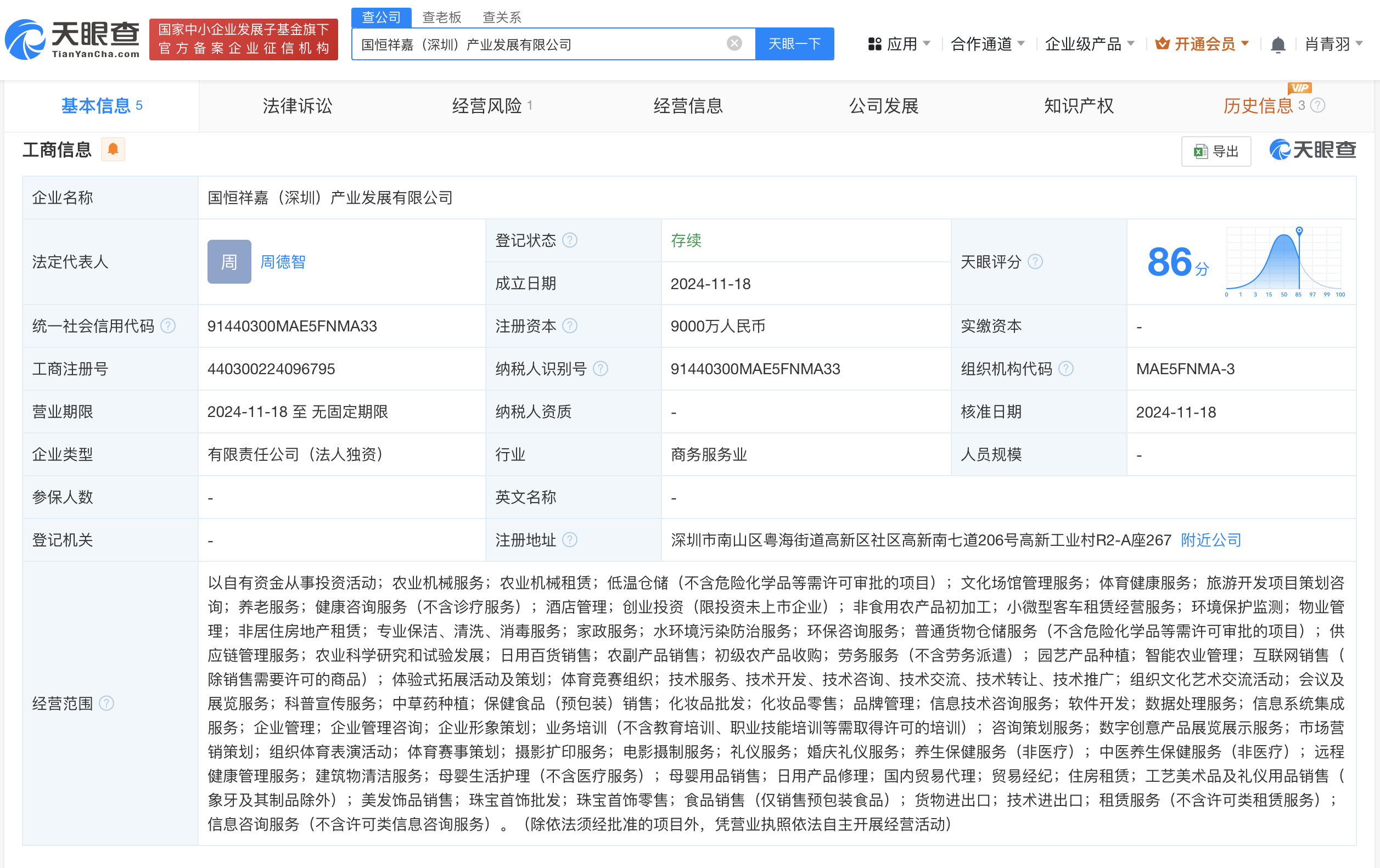 天眼查App显示,近日,国恒祥嘉(深圳)产业发展有限公司成立,法定代表人为周德智,注册资本9000万人民币,经营范围含以自有资金从事投资活动、农业机械服务、农业机械租赁、文化场馆管理服务、体育健康服务、旅游开发项目策划咨询、养老服务、健康咨询服务等。股权穿透图显示,该公司由中国光大国际信托投资公司全资持股,后者为中国光大集团股份公司全资子公司。