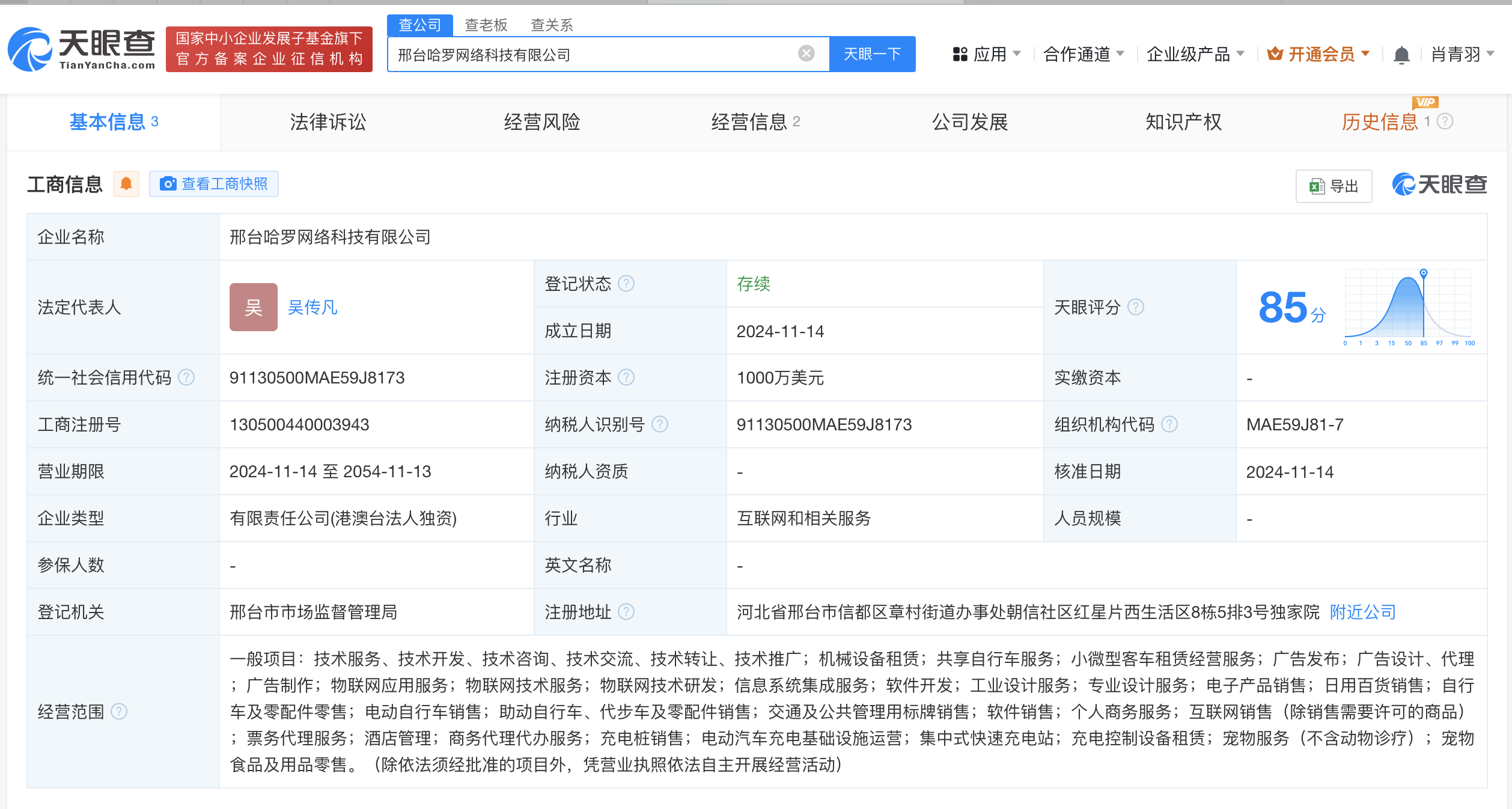 天眼查App显示,近日,邢台哈罗网络科技有限公司成立,法定代表人为吴传凡,注册资本1000万美元,经营范围含机械设备租赁、共享自行车服务、小微型客车租赁经营服务、广告制作、物联网应用服务、物联网技术服务等。股东信息显示,该公司由哈啰出行旗下Hong Kong RideTech Limited全资持股。
