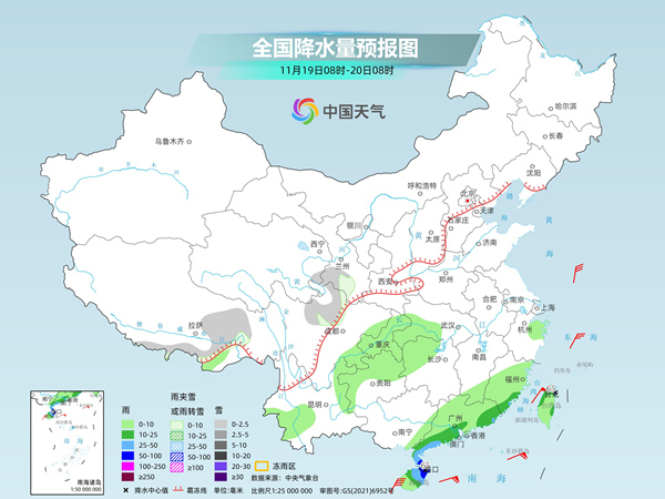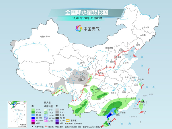 具体来看,中央气象台预计,今天,西藏东部和南部、甘肃中南部、川西高原北部等地部分地区有小雪或雨夹雪。福建东南部、华南南部、海南岛、台湾岛等地部分地区有中到大雨,其中,广东西南部沿海、海南岛东北部等地部分地区有暴雨。