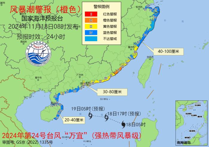 中新网11月18日电 据中国海洋预报网消息,国家海洋预报台根据《海洋灾害应急预案》,发布风暴潮橙色警报。受强冷空气和今年第24号台风“万宜”(强热带风暴级)的共同影响,预计:18日上午至19日上午,杭州湾至福建漳州沿海将出现40到100厘米的风暴增水,广东潮州至雷州半岛东岸沿海将出现30到80厘米的风暴增水,海南岛北部和东部沿海将出现20到40厘米的风暴增水。福建省漳州市的风暴潮预警级别为橙色;福建省福州市、泉州市、厦门市,广东省汕头市、汕尾市、惠州市、深圳市、广州市、中山市、珠海市和茂名市的风暴潮预警级别为黄色;浙江省嘉兴市、绍兴市、宁波市、舟山市、温州市,福建省宁德市、莆田市,广东省江门市、阳江市、湛江市,海南省海口市、文昌市和琼海市的风暴潮预警级别为蓝色。上述岸段正处天文大潮期,请沿海政府及相关部门按照职责做好防御风暴潮的应急准备工作;各涉海相关生产单位采取积极有效的措施,组织渔船、养殖渔排、养殖场等做好防御工作;加固沿海渔业养殖水产设施和渔港设施,做好防潮准备。