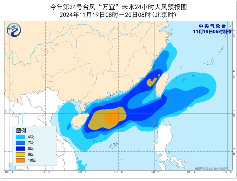19日08时至20日08时,受冷空气和“万宜”的共同影响,台湾海峡、台湾以东洋面、巴士海峡、南海北部和中西部、琼州海峡、北部湾、东沙群岛、西沙群岛、台湾岛沿海、福建沿海、广东沿海、海南岛沿海将有6-8级,阵风9-10级的大风,其中台湾海峡、南海北部风力有9级,阵风10-11级,台风中心经过的海域或地区风力有10级,阵风11-12级。