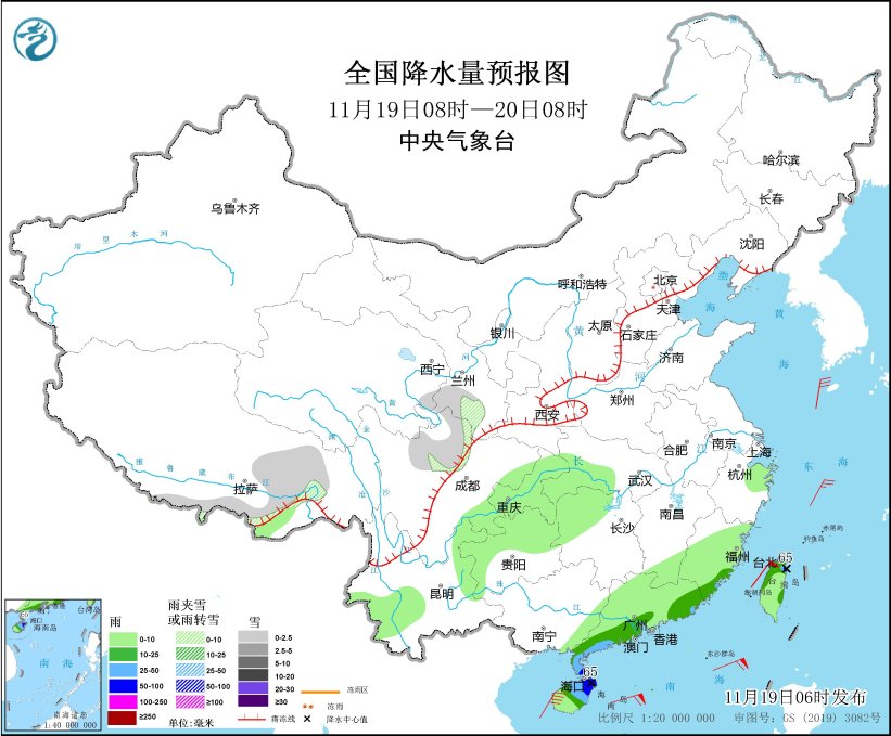 11月19日08时至20日08时,西藏东部和南部、甘肃中南部、川西高原北部等地部分地区有小雪或雨夹雪。福建东南部、华南南部、海南岛、台湾岛等地部分地区有中到大雨,其中,广东西南部沿海、海南岛东北部等地部分地区有暴雨(50~65毫米)。