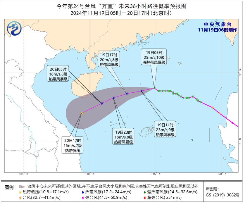预计,“万宜”将以每小时15-20公里的速度向西偏南方向移动,逐渐向海南岛东部海面靠近,强度逐渐减弱(见图1)。中央气象台11月19日06时继续发布台风蓝色预警。