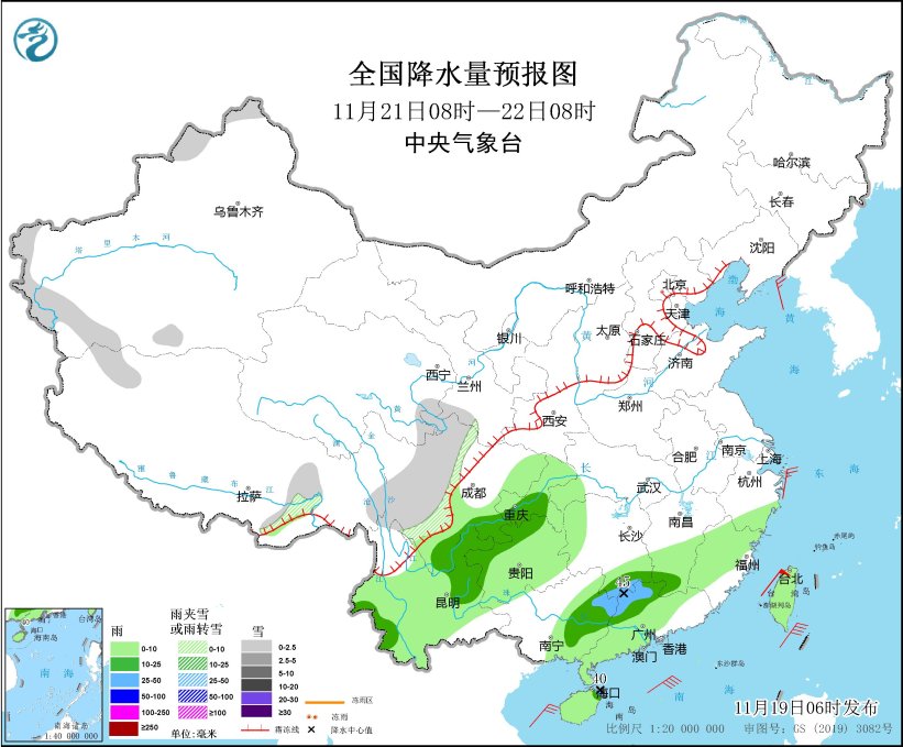 11月21日08时至22日08时,新疆北疆北部和南疆盆地、西藏东部和西部、青海南部、甘肃南部、西南地区北部、四川南部等地部分地区有小雪或雨夹雪。湖南西部、江南东部和南部、西南地区东部和南部、华南大部、台湾岛等地部分地区有小到中雨,其中,湖南南部、广西东北部、广东西北部、海南岛东北部等地部分地区有大雨(25~45毫米)。