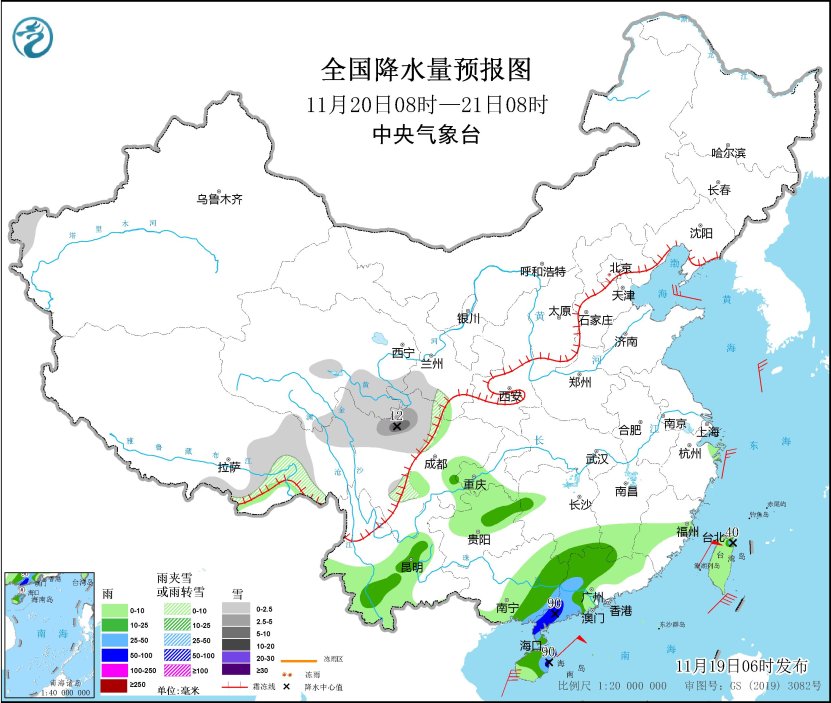 11月20日08时至21日08时,新疆南疆西部山区、西藏东部和南部、青海南部、甘肃南部、西南地区北部等地部分地区有小雪或雨夹雪,其中,川西高原北部等地部分地区有中雪,川西高原北部等地局地暴雪(10~12毫米)。云南西南部和中部、广西东北部、华南南部、广东西北部、海南岛等地部分地区有中到大雨,其中,广东西南部、海南岛东北部等地部分地区有暴雨(50~90毫米)。