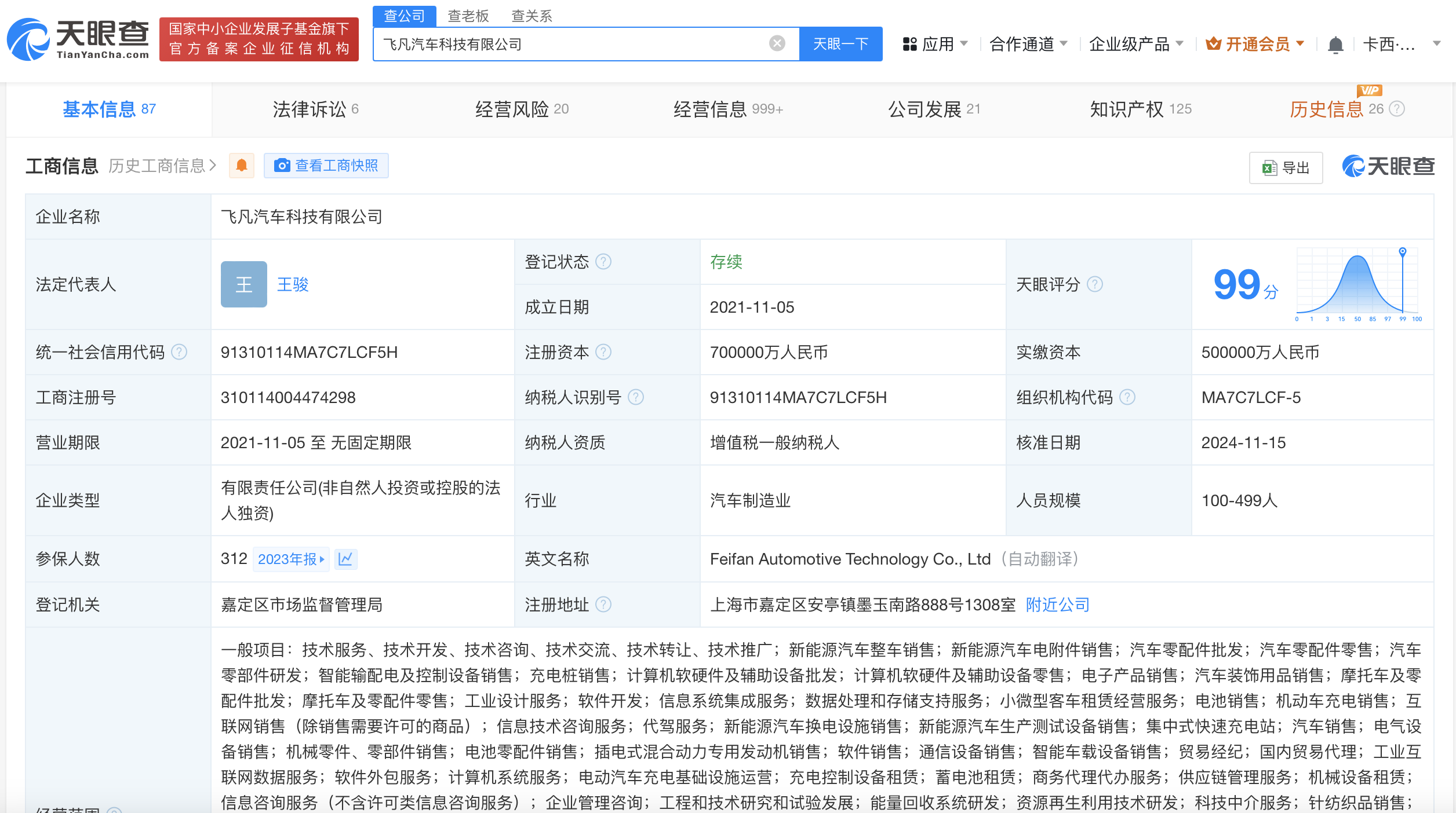 飞凡汽车科技有限公司成立于2021年11月,注册资本70亿人民币,经营范围含新能源汽车整车销售、新能源汽车换电设施销售、新能源汽车生产测试设备销售、集中式快速充电站等,现由上汽集团(600104)全资持股。