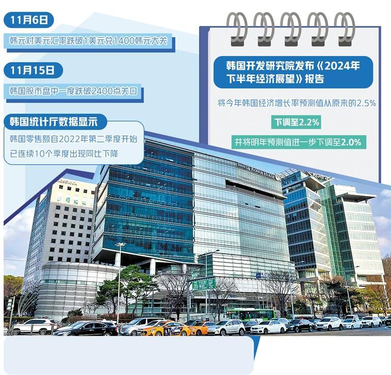针对目前韩国经济的困境,韩国开发研究院近日发布了《2024年下半年经济展望》报告,将韩国今年的经济增长率预测值从原来的2.5%下调至2.2%,并将明年韩国经济的预测值进一步下调至2.0%。