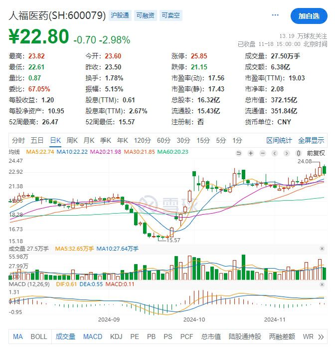 截至11月18日收盘,人福医药报收22.80元/股,跌2.98%,总市值372.15亿元。