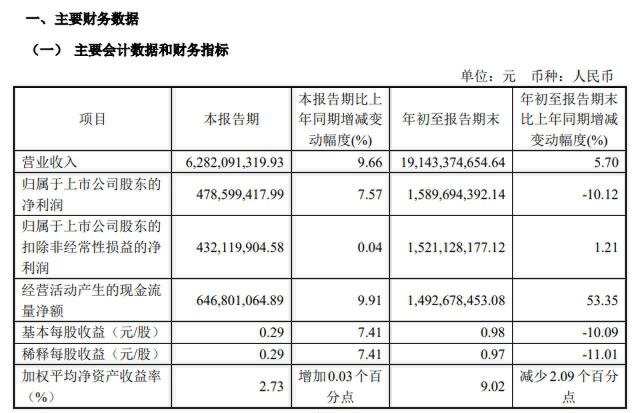 该公司2024年第三季度实现营业收入62.82亿元,同比增加9.66%;归属于上市公司股东的净利润4.79亿元,同比增加7.57%;基本每股收益0.29元。