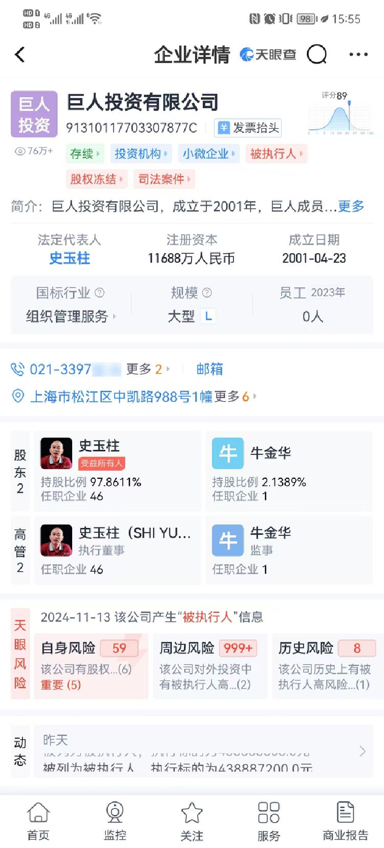 11月18日,天眼查信息显示,史玉柱、莫立军、曲敬慧新增一条被执行人信息,涉及金额3.5亿元,由北京金融法院负责执行。