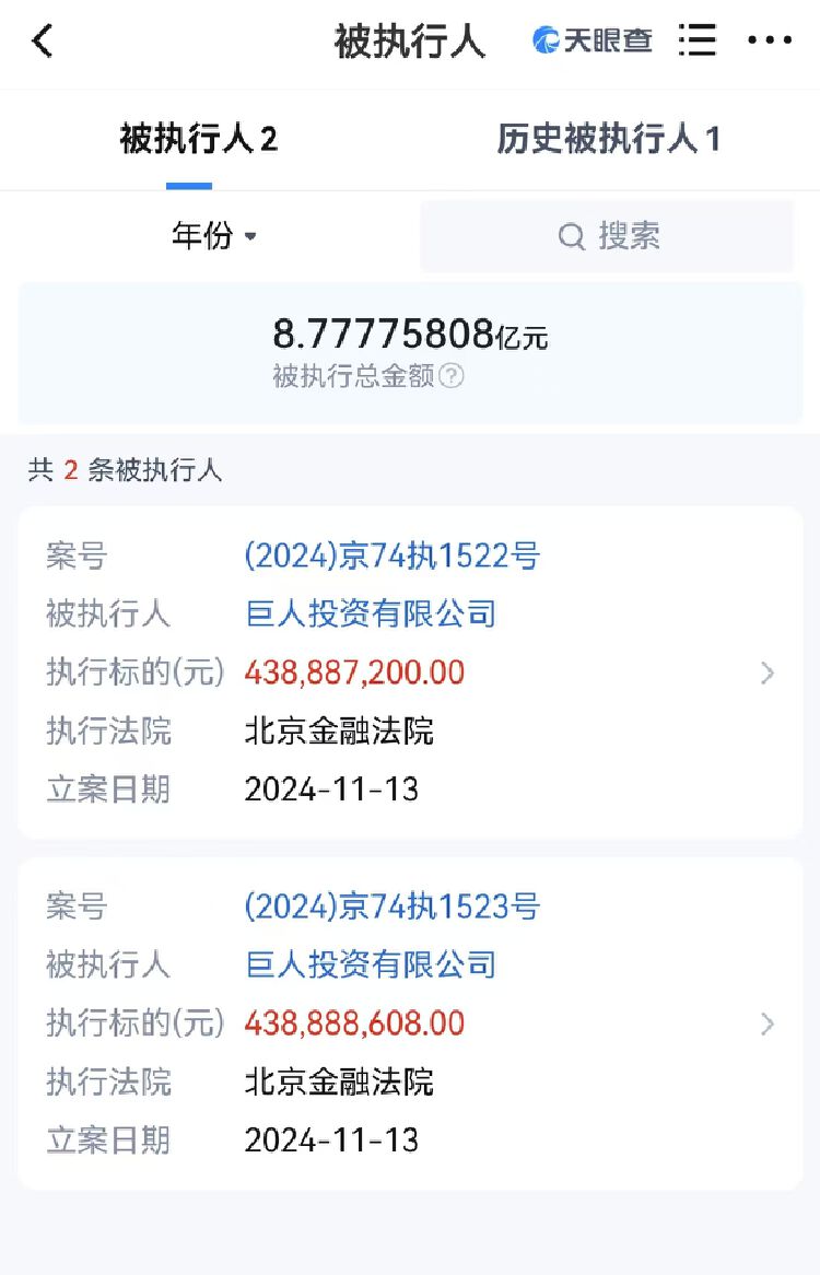 同时,巨人投资有限公司及上海巨人投资管理有限公司也分别新增两条被执行人信息,执行标的总计8.7亿元,同样由北京金融法院执行。