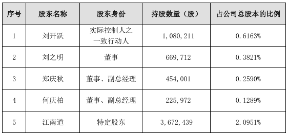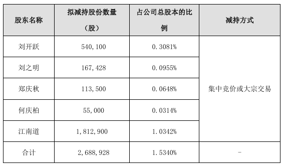 其中,刘开跃计划减持不超过54.01万股,刘之明计划减持不超过16.74万股,郑庆秋计划减持不超过11.35万股,何庆柏计划减持不超过5.50万股,江南道计划减持不超过181.29万股。合计减持约269万股,占公司总股本的1.5340%。