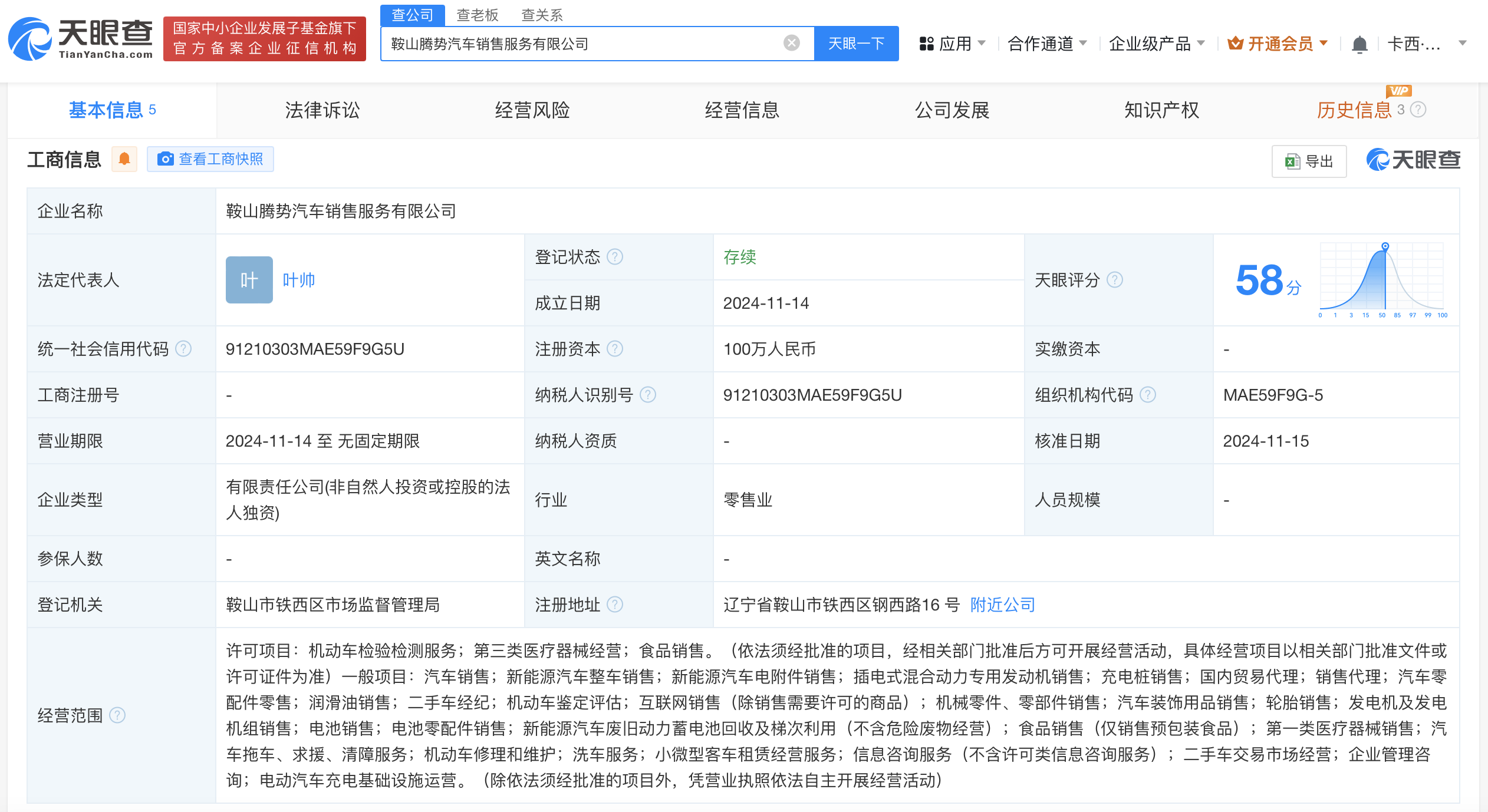 天眼查App显示,近日,鞍山腾势汽车销售服务有限公司成立,法定代表人为叶帅,注册资本100万人民币,经营范围含汽车销售,新能源汽车整车销售,新能源汽车电附件销售等。股权全景穿透图显示,该公司由腾势汽车销售服务有限公司全资持股,后者为比亚迪汽车工业有限公司全资子公司。