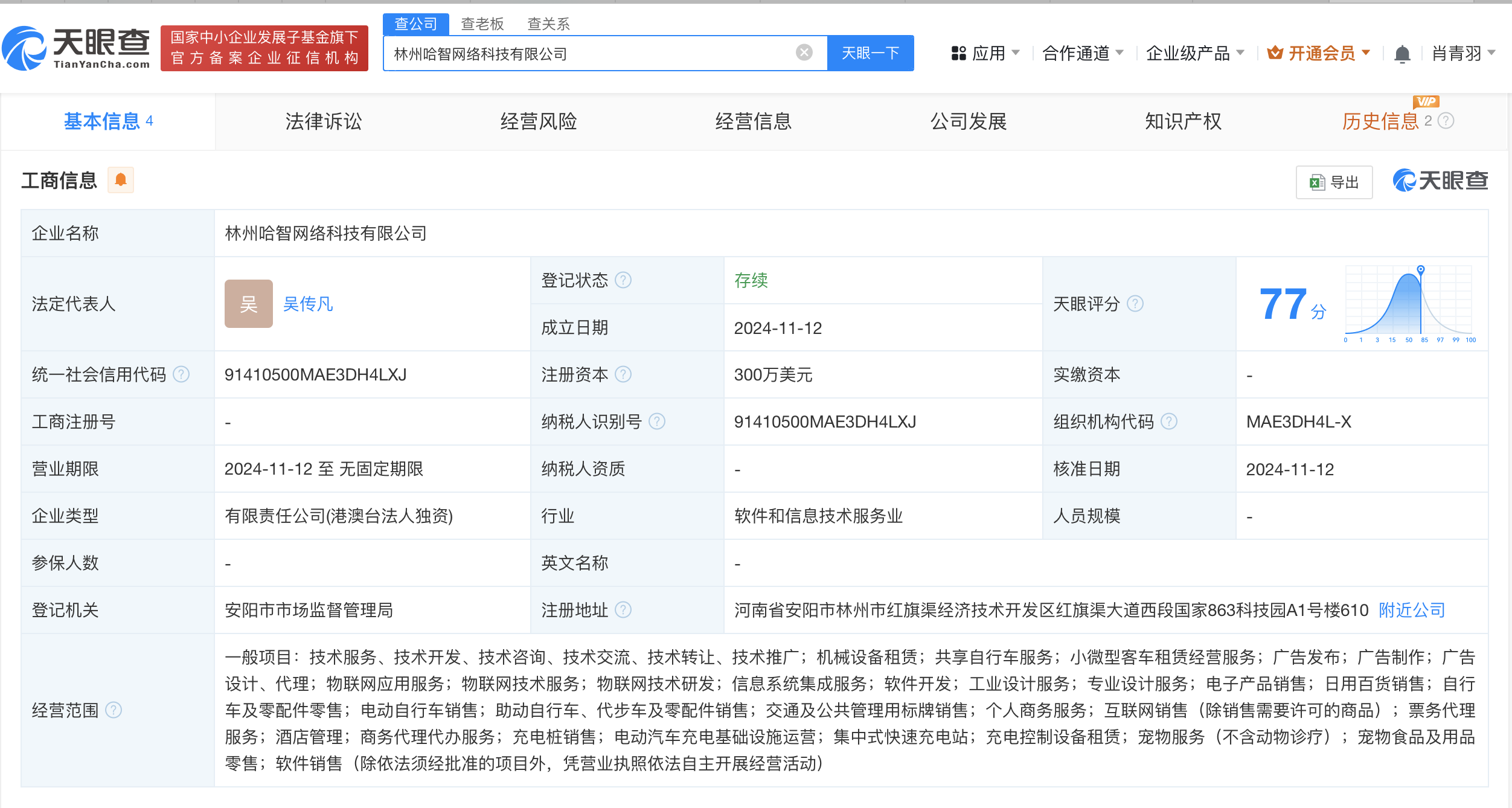 天眼查App显示,近日,林州哈智网络科技有限公司、常州哈智网络科技有限公司成立,法定代表人均为吴传凡,注册资本分别为300万美元、3000万美元,经营范围均包含自行车及零配件零售、电动自行车销售、交通及公共管理用标牌销售、软件销售、个人商务服务、互联网销售等。股东信息显示,上述两家公司均由Hong Kong RideTech Limited全资持股。值得一提的是,近期,Hong Kong RideTech Limited已在邢台、宝鸡、咸阳等多地成立网络科技公司。