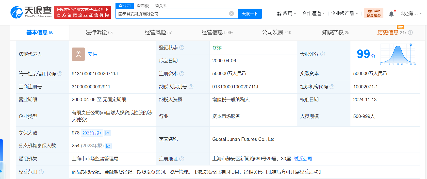 国泰君安期货有限公司成立于2000年4月,法定代表人为姜涛,经营范围含商品期货经纪、金融期货经纪、期货投资咨询、资产管理,由国泰君安(601211)全资持股。