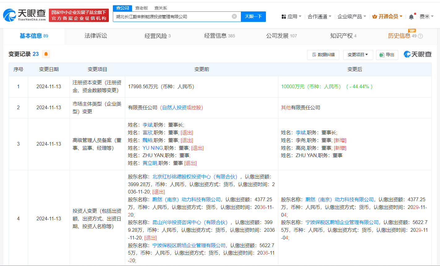 天眼查App显示,近日,“蔚来资本”关联公司湖北长江蔚来新能源投资管理有限公司发生工商变更,原股东红杉中国旗下北京红杉铭德股权投资中心(有限合伙)、昆山兴华投资咨询中心(有限合伙)退出,注册资本由约1.8亿人民币减至1亿人民币,同时多位高管发生变更。