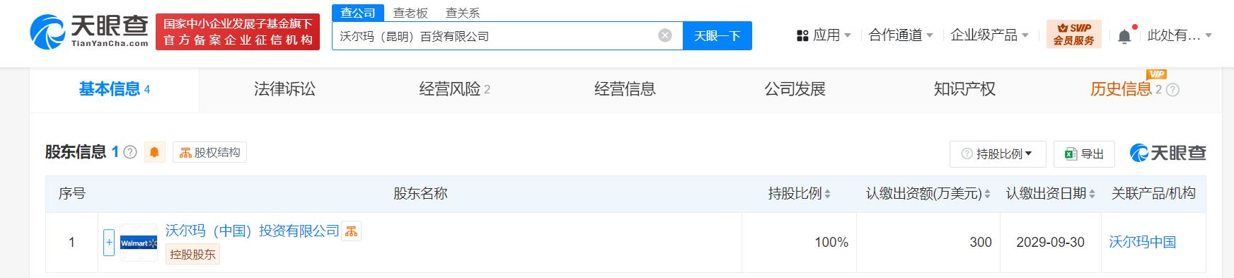 天眼查App显示,近日,沃尔玛(昆明)百货有限公司成立,法定代表人为祝骏,注册资本300万美元,经营范围含食品互联网销售、单用途商业预付卡代理销售、票务代理服务、新能源汽车整车销售、汽车零配件零售、非食用农产品初加工、互联网销售、汽车装饰用品销售、智能无人飞行器销售等。股东信息显示,该公司由沃尔玛(中国)投资有限公司全资持股。