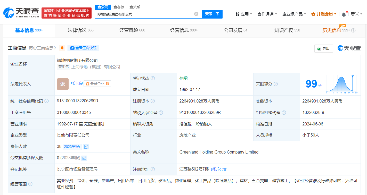 绿地控股集团有限公司成立于1992年7月,法定代表人为张玉良,注册资本约226.5亿人民币,由绿地控股集团股份有限公司、绿地金创科技集团有限公司共同持股。天眼风险信息显示,该公司现存多条被执行人、股权冻结及终本案件信息。